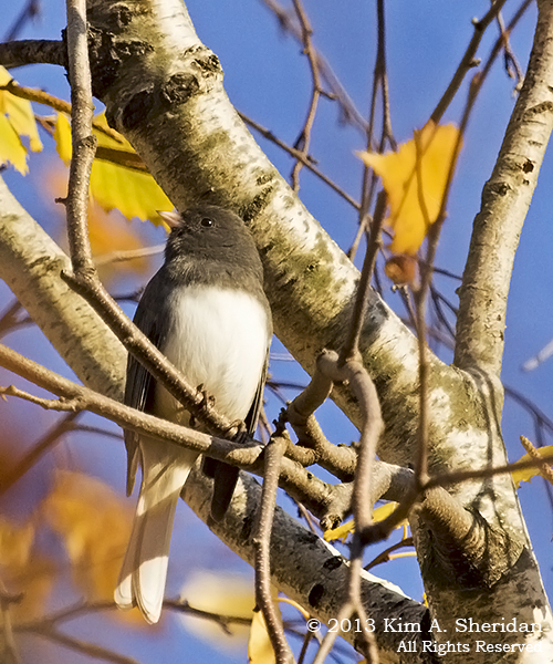 At the water’s edge an Eastern Kingbird perches sprightly on a gray-barked branch. In his dark ash suit and white waistcoat, he looks the part of a nattily attired young businessman.