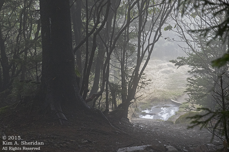 The day was damp and foggy (so what else is new?), and it got damper and foggier once on the trail. We walked through a boreal forest dripping with mist.