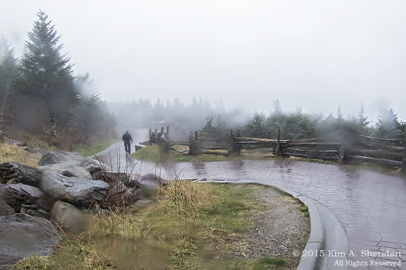 The weather, that’s what. This was one of the rainiest days of the trip, and the clouds pressed so close to the road we couldn’t see a thing beyond the grassy verge. On Mt. Mitchell, it was 47° and so windy it was raining sideways. Undeterred, we forged onward and upward.