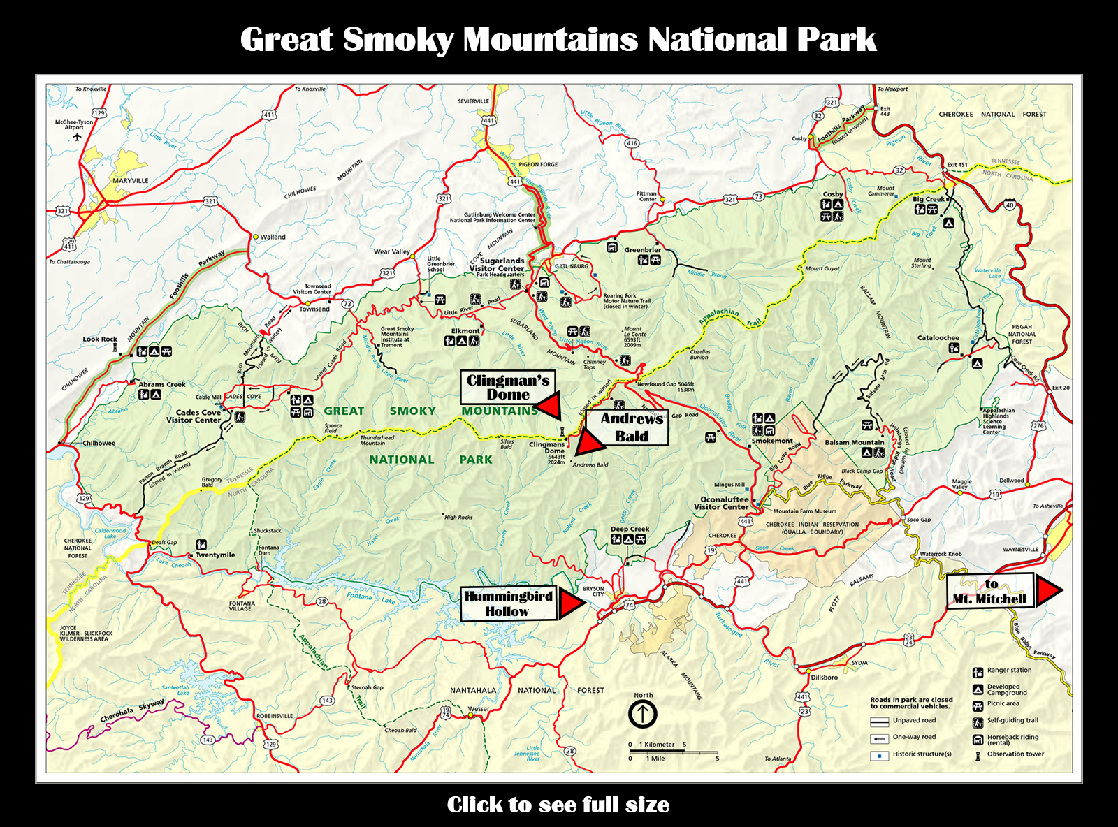 Andrews Bald, elevation 5,906′. Clingman’s Dome, elevation 6,644′, the highest peak in the Smokies, the third highest mountain east of the Mississippi. Mt. Mitchell, 6,684’, the highest peak east of the Mississippi.