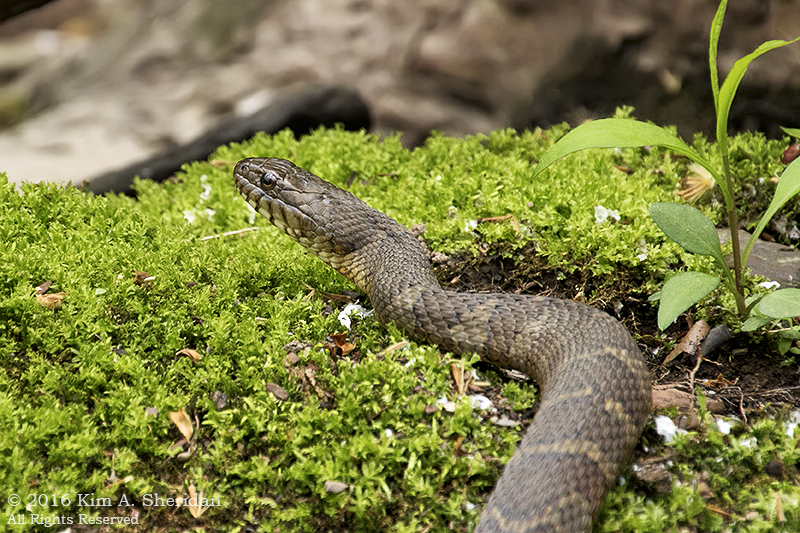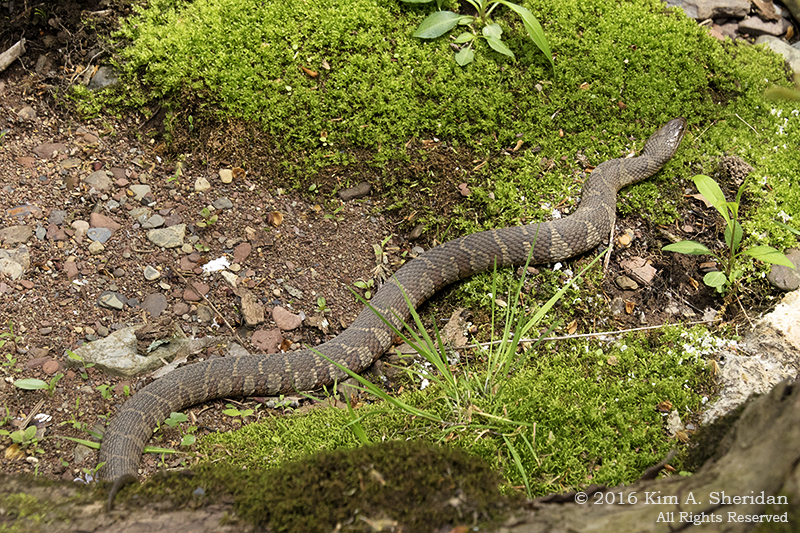 Corporal Kim was suddenly startled by the sight of a large snake at her feet, slithering away from her with all due haste. Seems the plucky lass had unwittingly trod upon its tail. Upon reaching the water’s edge, it forgot its annoyance and fear, and posed quietly for a series of photographs.