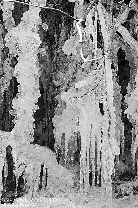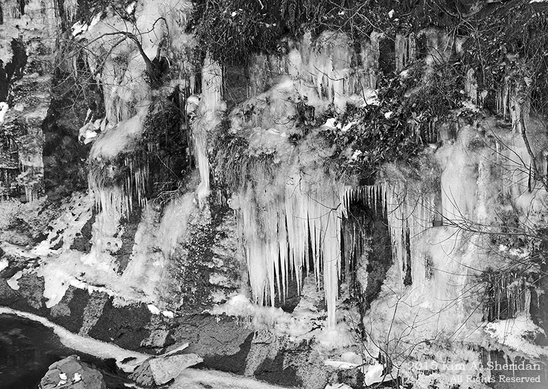 There’s a lot of water flowing behind the spikes and icicles formed here. More and more of it froze every day. In only one week, the ice would grow into the thick solid curtain seen below, dusted with a recent snowfall.