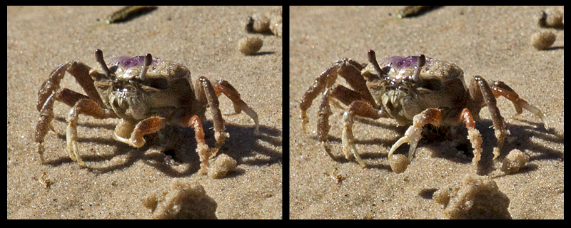 Crab Collage 1Fiddlers eat by scooping up mud or sand (left), removing algae and other organic material, and then returning the mud in the form of a pellet (right). Females like this one rapidly alternate between both claws as they feed. A male crab’s large claw is useless to eat with, so he has to eat one-handed.