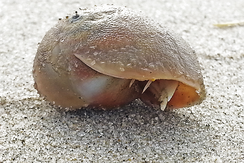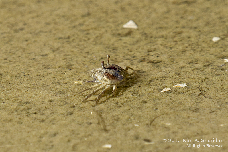 OC Hermit Crab_091753a Here’s a different sort of crab – a flat-clawed hermit crab. Hermit crabs are soft-bodied, and must find someone else’s shell to live in, typically abandoned sea snail shells. I collect a type of moon shell known as a shark’s eye. Usually they’re empty, but I was delighted to find someone at home in this one! I couldn’t coax him out to play, though. Hermits are usually nocturnal, so probably he’d have rather been napping. (It makes me cringe to admit it, but these are cell phone photos. It was all I had with me at the time.)