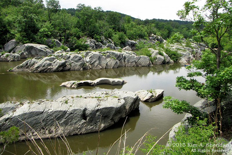 The Susquehanna River is punctuated here by three hydro-electric dams. Between the dams is the Susquehanna Gorge. At one time it was 400’ or more deep, where the river carved through bedrock of Wissahickon schist, forming spectacular sculpted rock formations, potholes and three levels of terraces. Now much of it is below the still, lake-like waters. Only where the water is shallow, just below the dams, do the geological wonders appear.