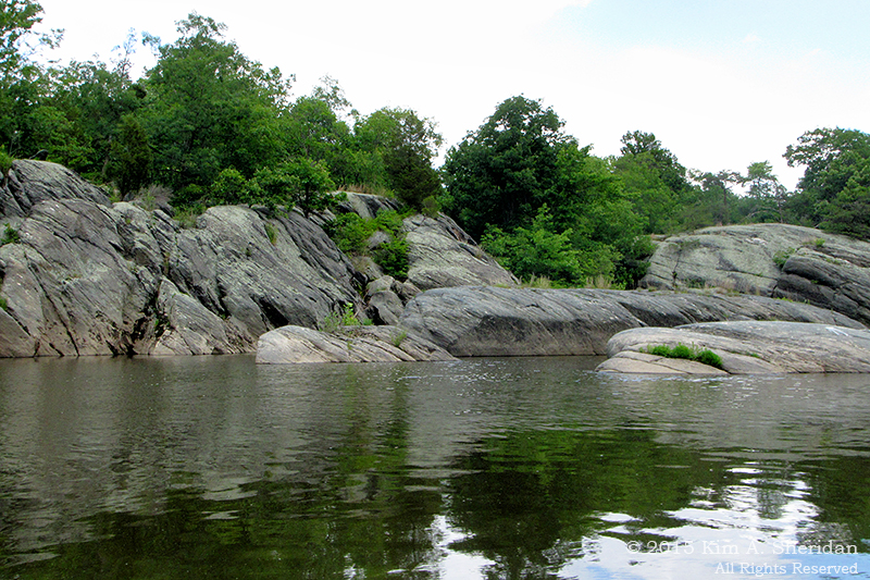 Above Upper Bear Island, about a mile and a half from the dam, we began to see signs of trouble. Or rather, we didn’t see trouble, which came in the form of shallow rocks just below the opaque surface. You’d be paddling along, admiring the scenery, and suddenly find yourself spinning sideways and threatening to tip over. Getting unstuck was challenging, and left me with wet shirt sleeves.