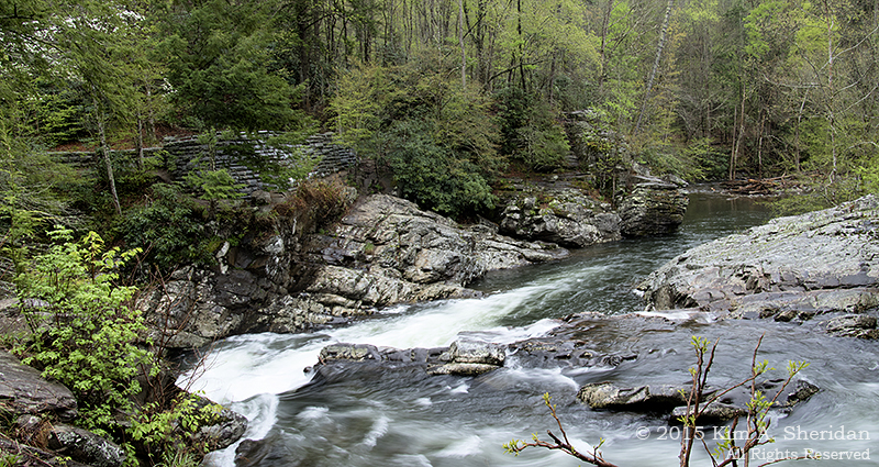 The river below the Falls threads through a jumble of sharp sandstone boulders under verdant tree boughs.